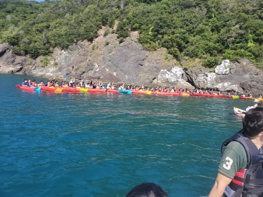 高校生の修学旅行、シーカヤックをを並べて船団を作り記念撮影。この船団を作るのが一苦労!