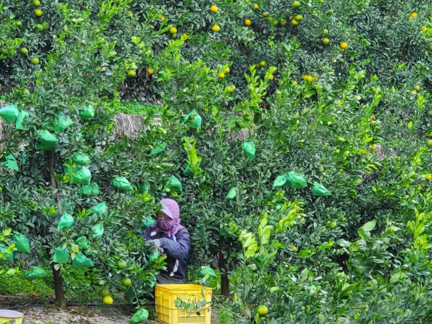 高級みかん(清見など)の袋掛け 寒波で果実が凍るのを防いだり、鳥につつかれないようにするため、一個ずつ紙の袋をかぶせていきます。