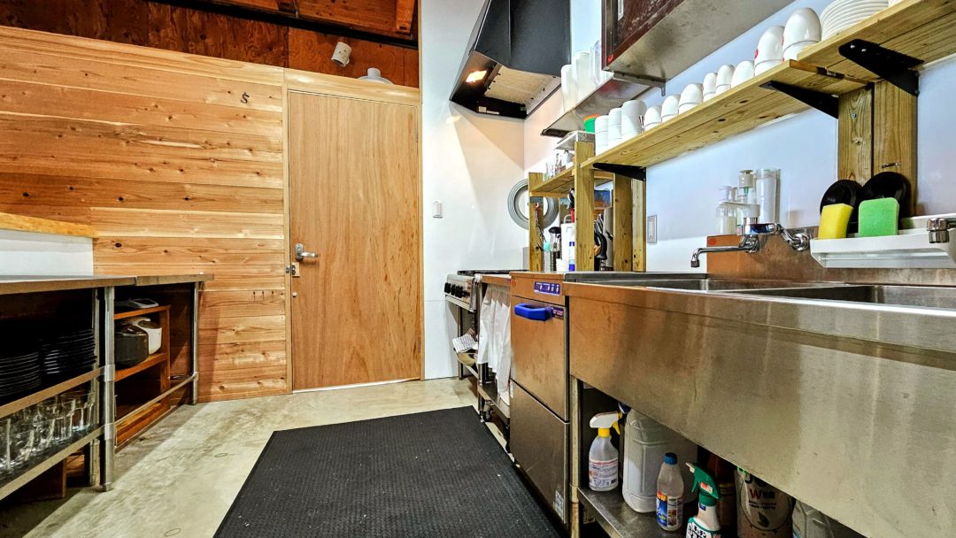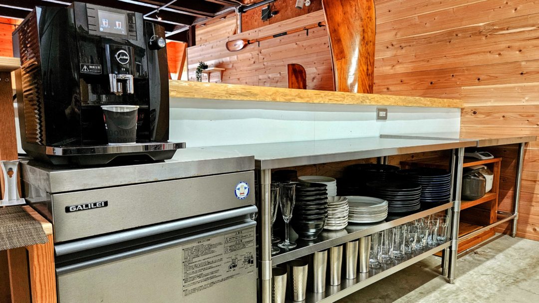 1階には大型冷蔵庫、高火力コンロ、広い調理スペース、自動製氷機を備えたカフェ仕様の本格キッチンを完備しています。