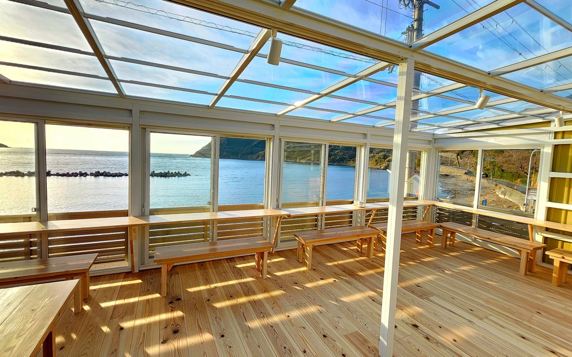 テラスや窓からは栖原海岸の景色が広がります。