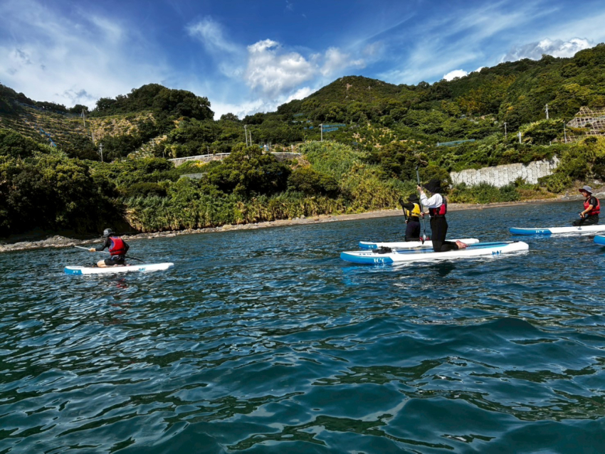 すはら海岸のミカン畑をバックに、SUPで颯爽たる姿をお見せしたかったのですが、風が強くて……