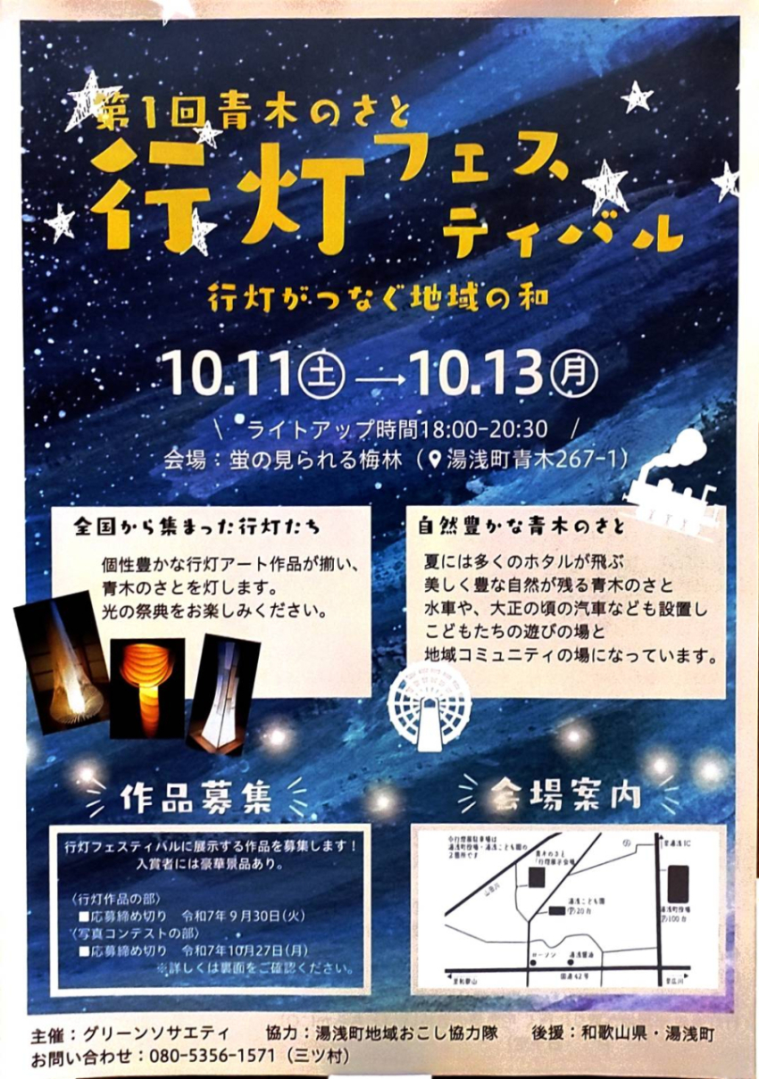 行灯フェスティバル10月11日~13日「青木のさと」会場へのアクセスは、湯浅町役場に駐車をされて係員の案内人に従ってください。